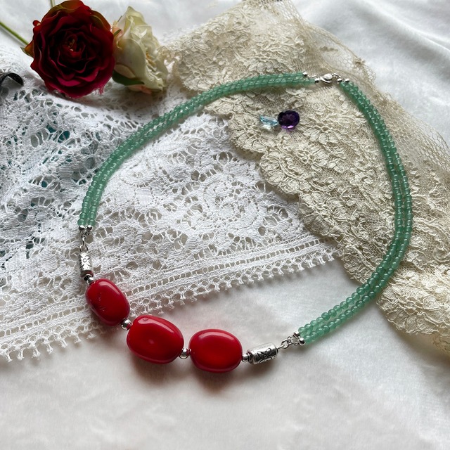 赤が鮮やかな珊瑚とインド翡翠のネックレス