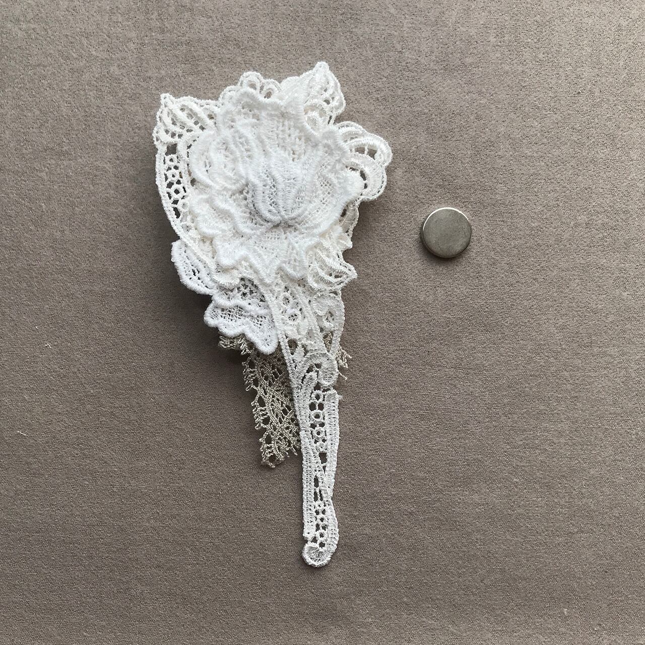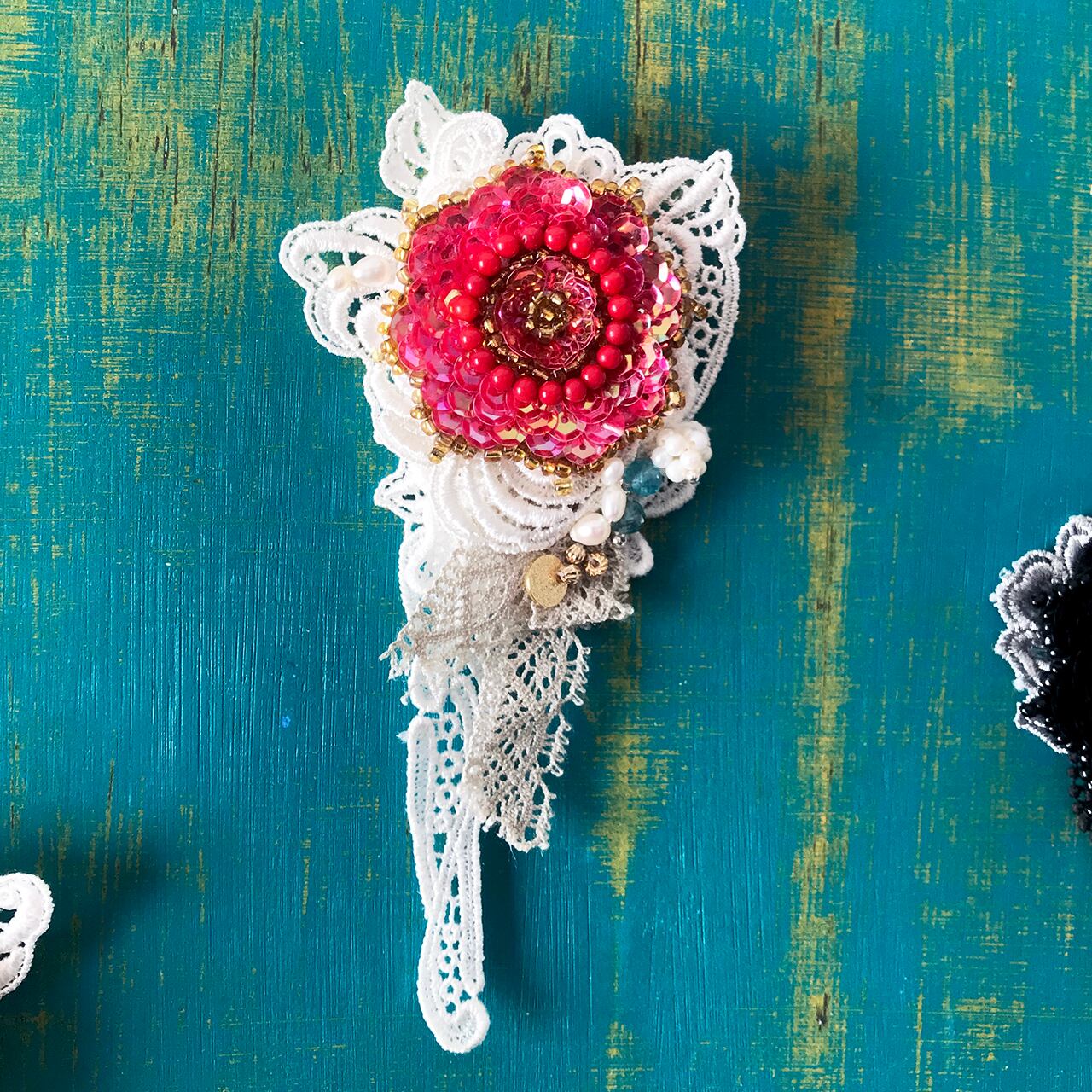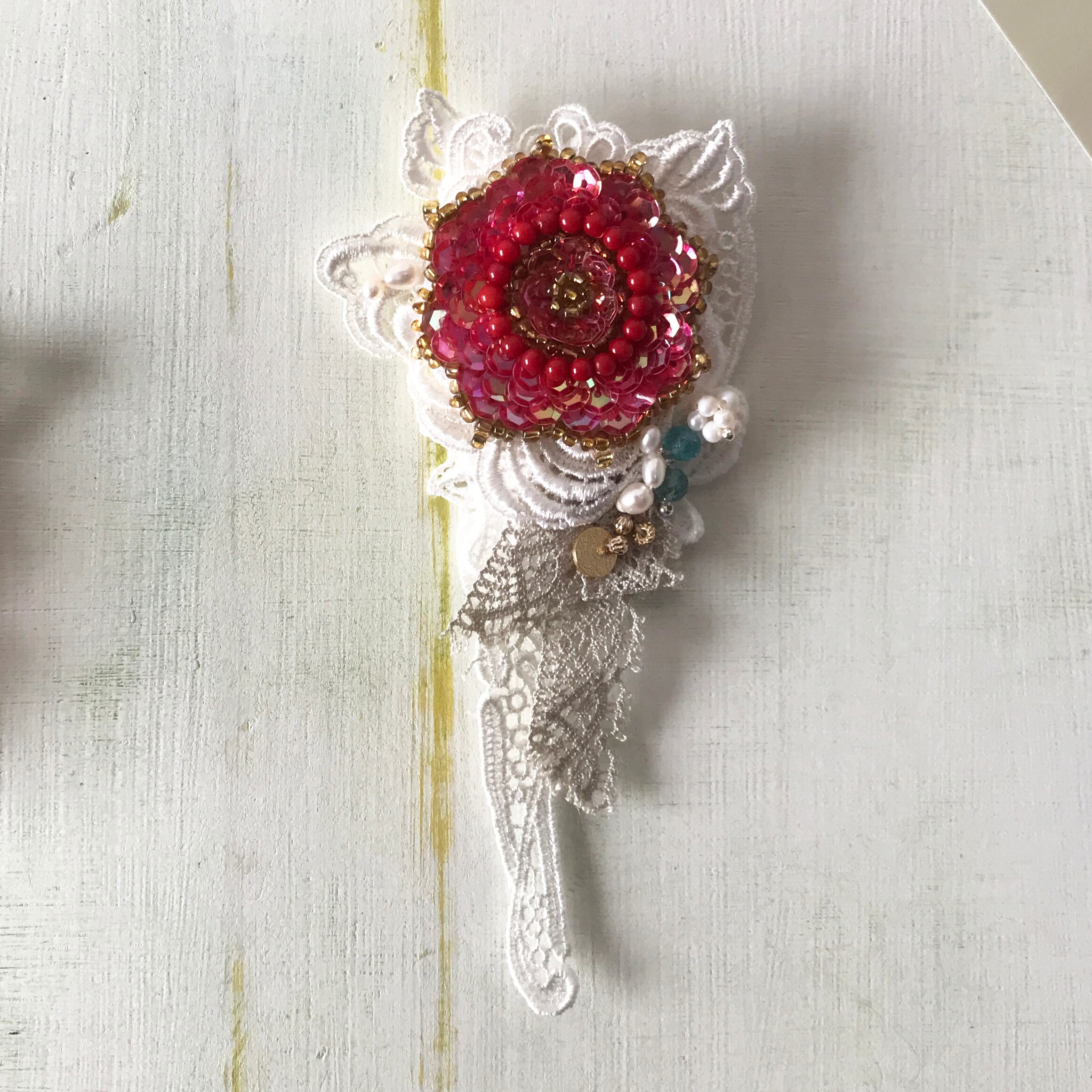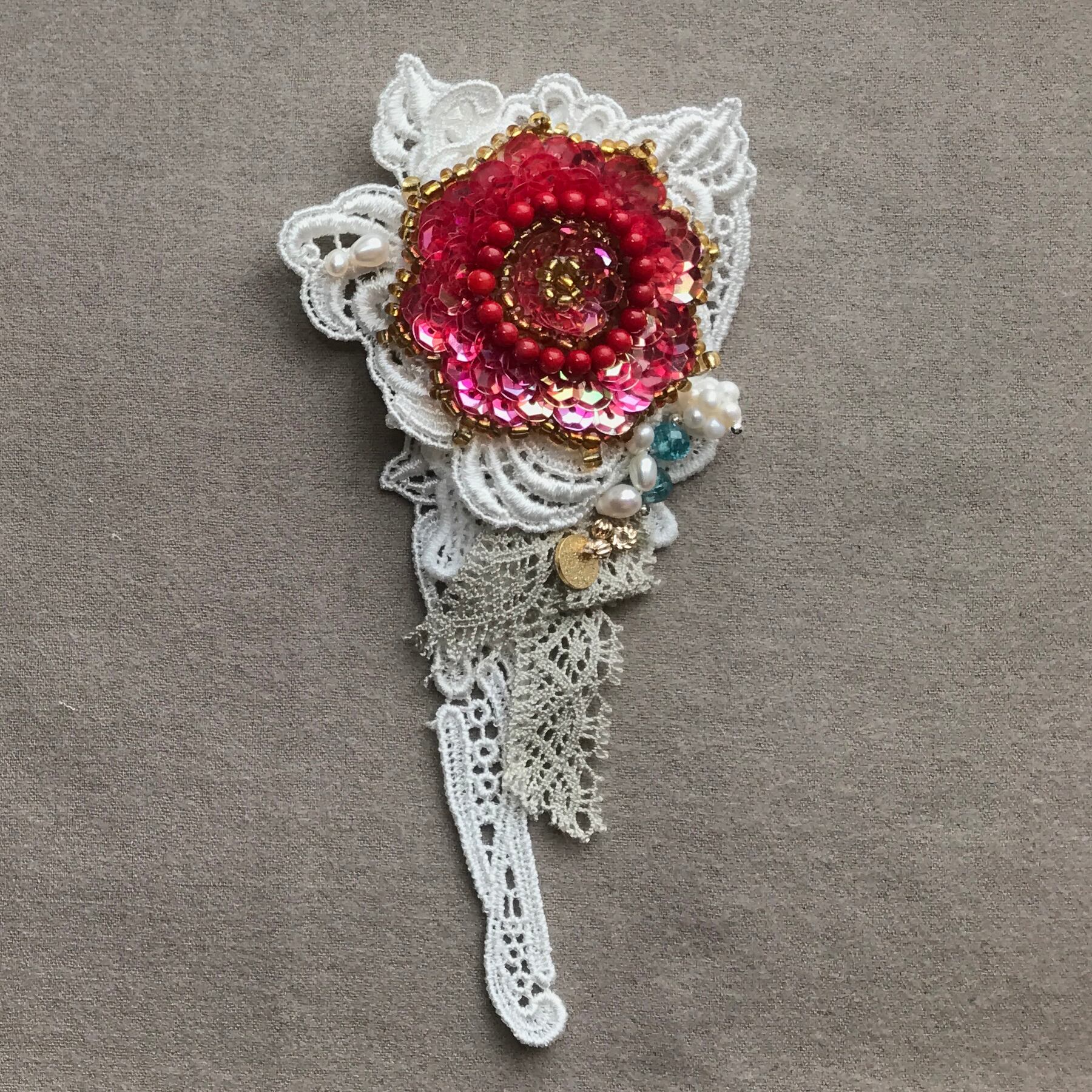 ピンクのスパンコールフラワーに珊瑚ビーズを重ねたレースのブローチ。