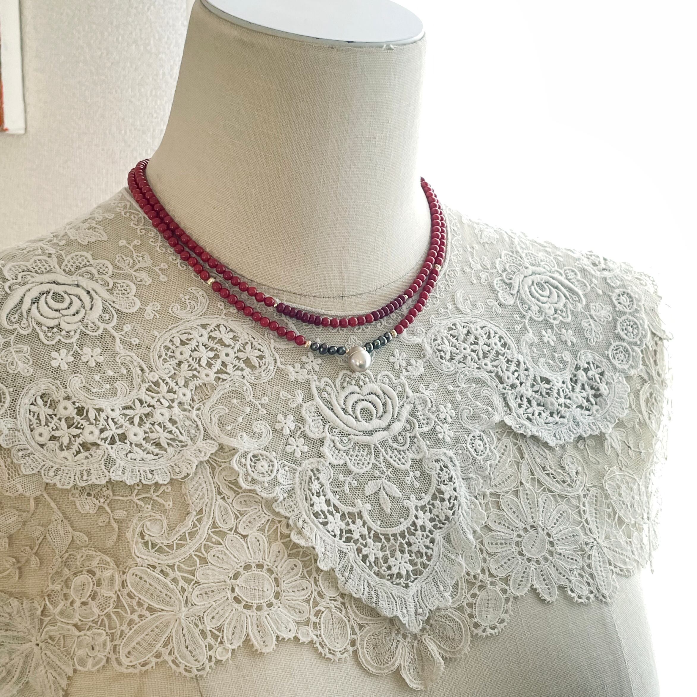 それぞれ2色使いのネックレスを重ねています。