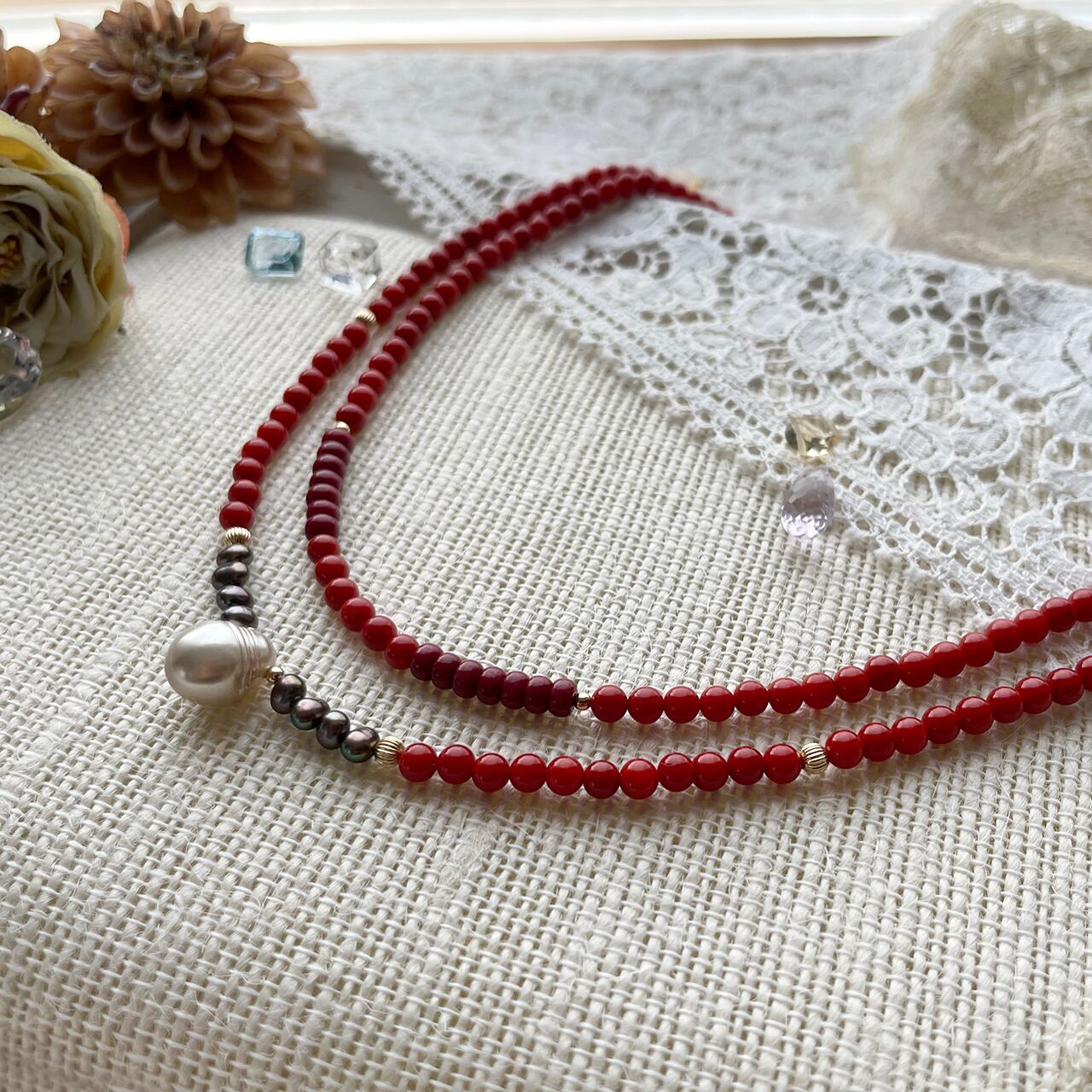 使用した天然石・ビーズは本珊瑚・淡水パール・K18GFです。