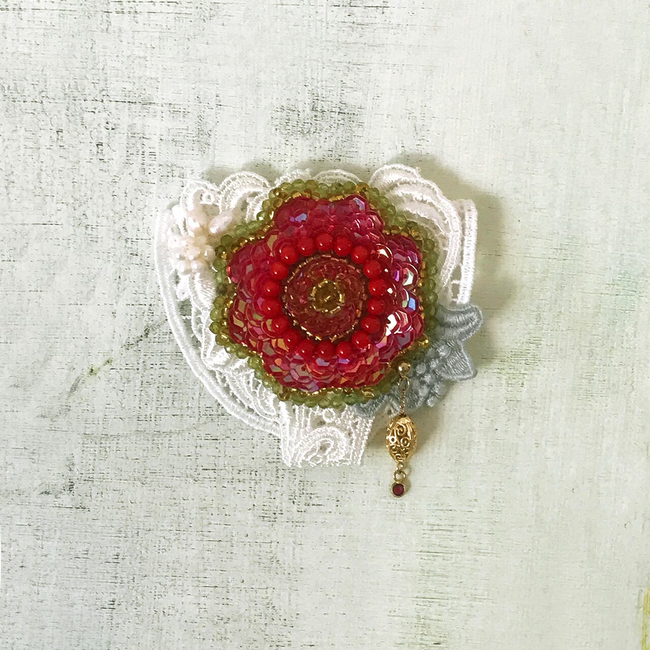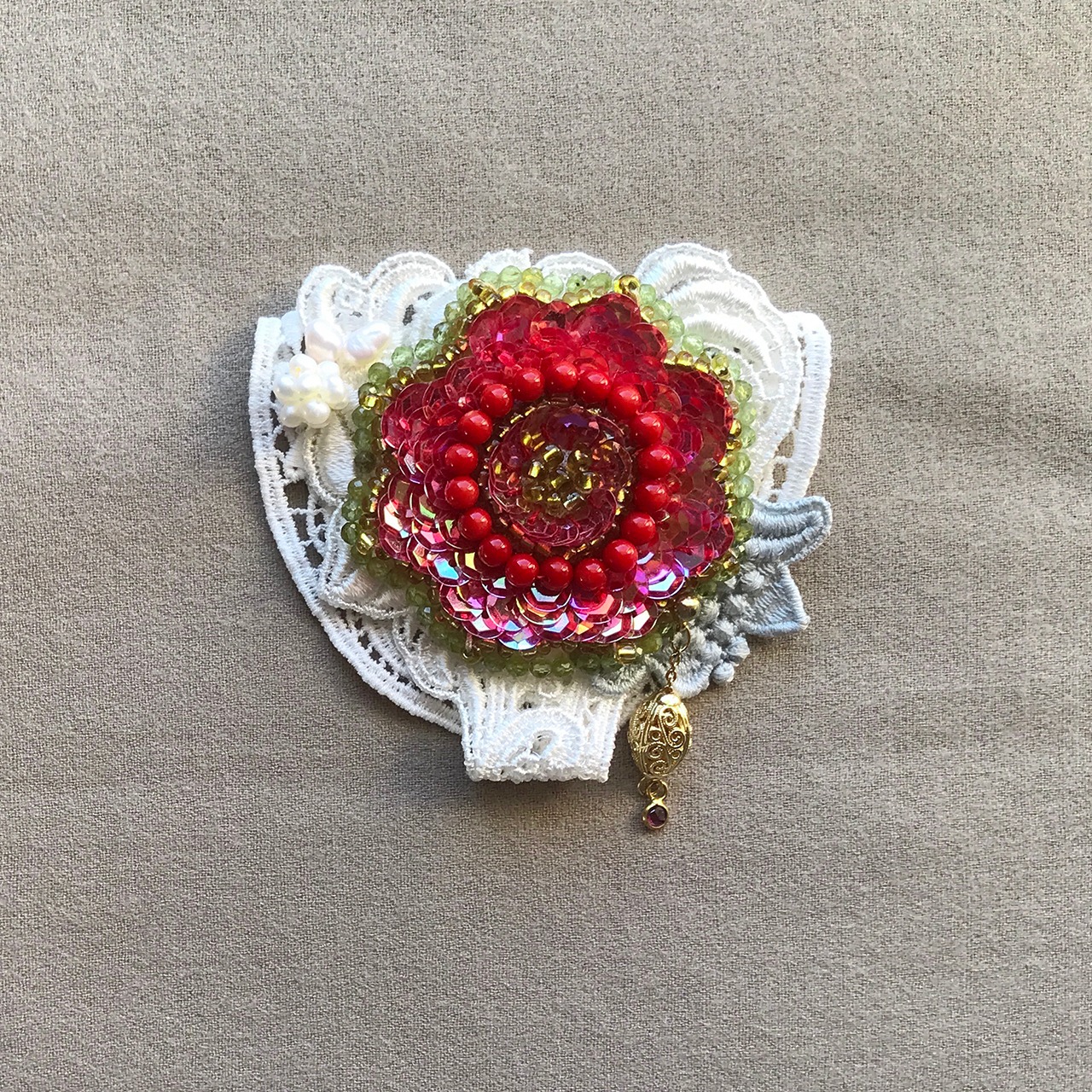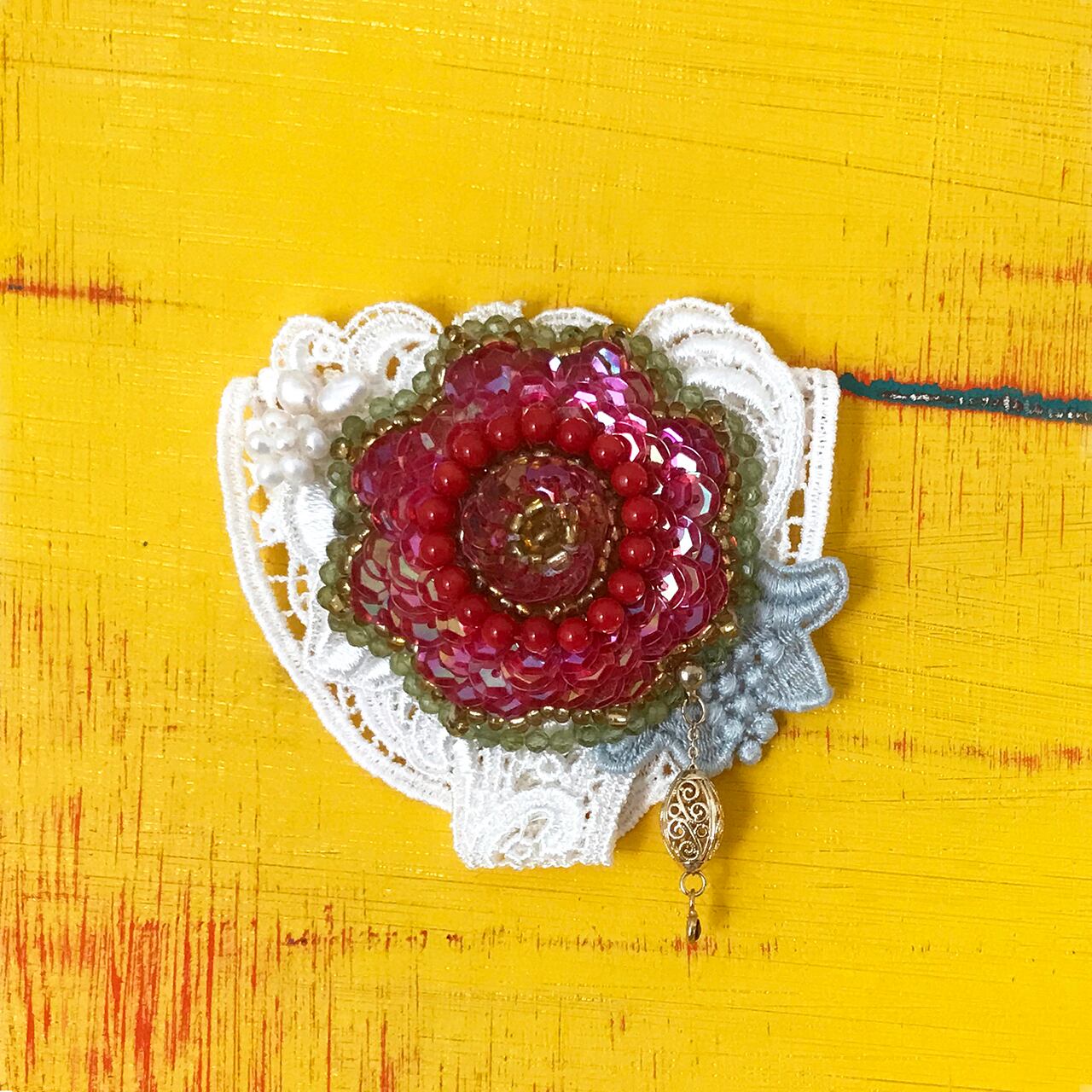 赤いスパンコールフラワーに本珊瑚とペリドットのビーズがついた白のレースブローチ。