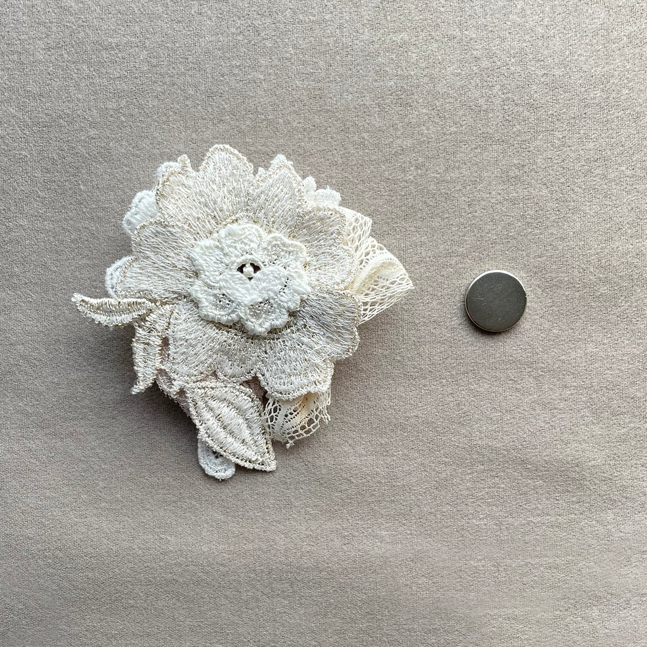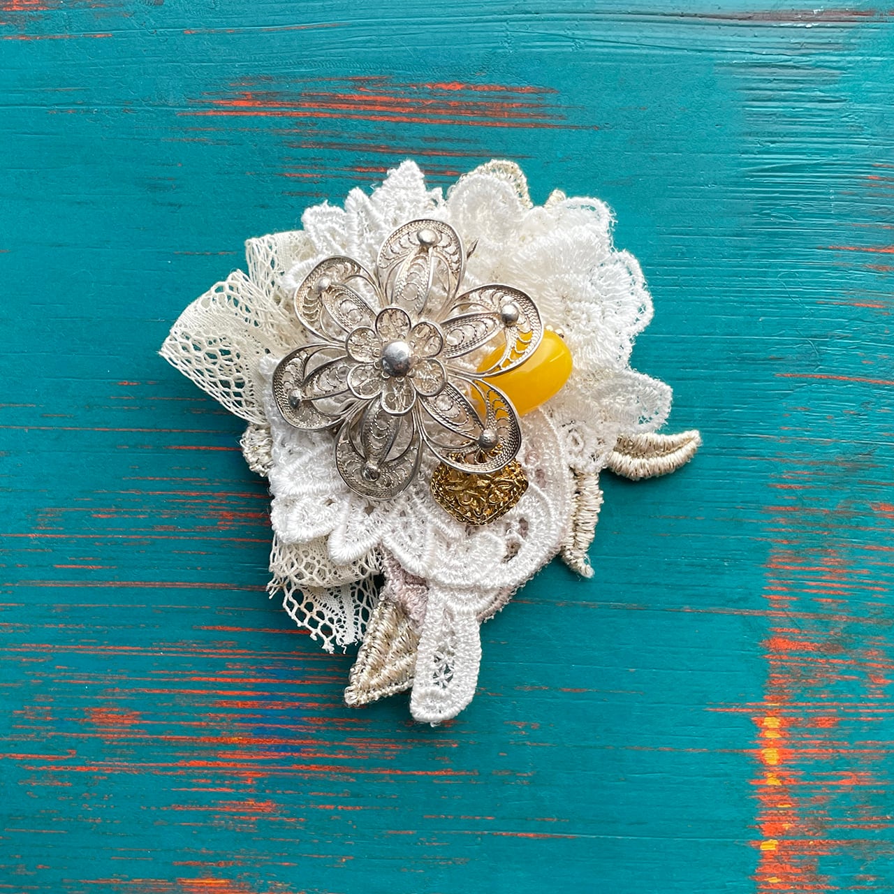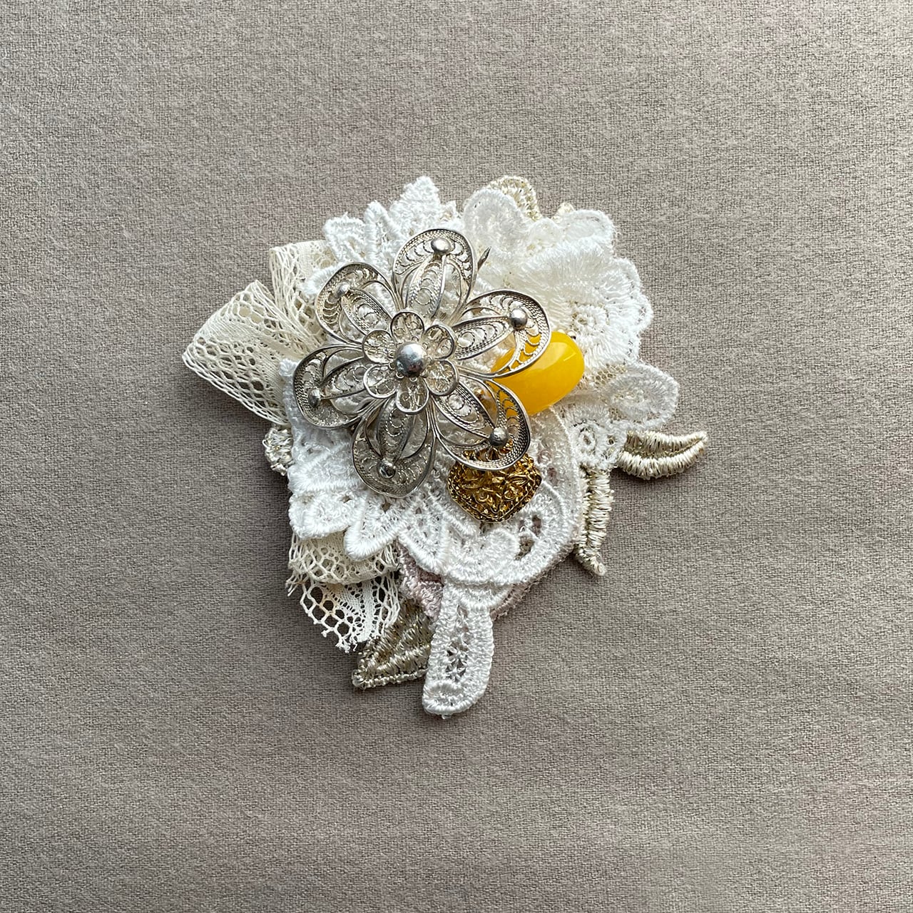 シルバーのアンティークブローチの台座にレースを使ったブローチ。