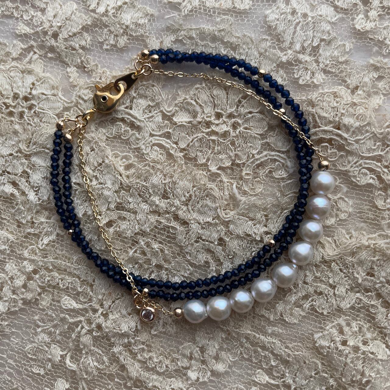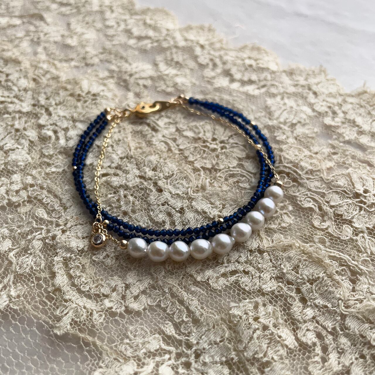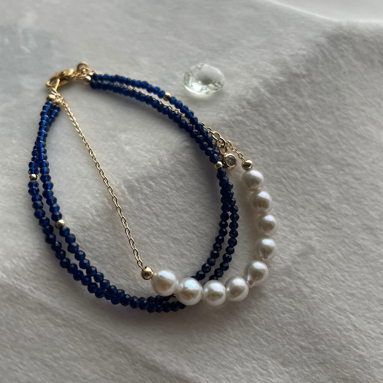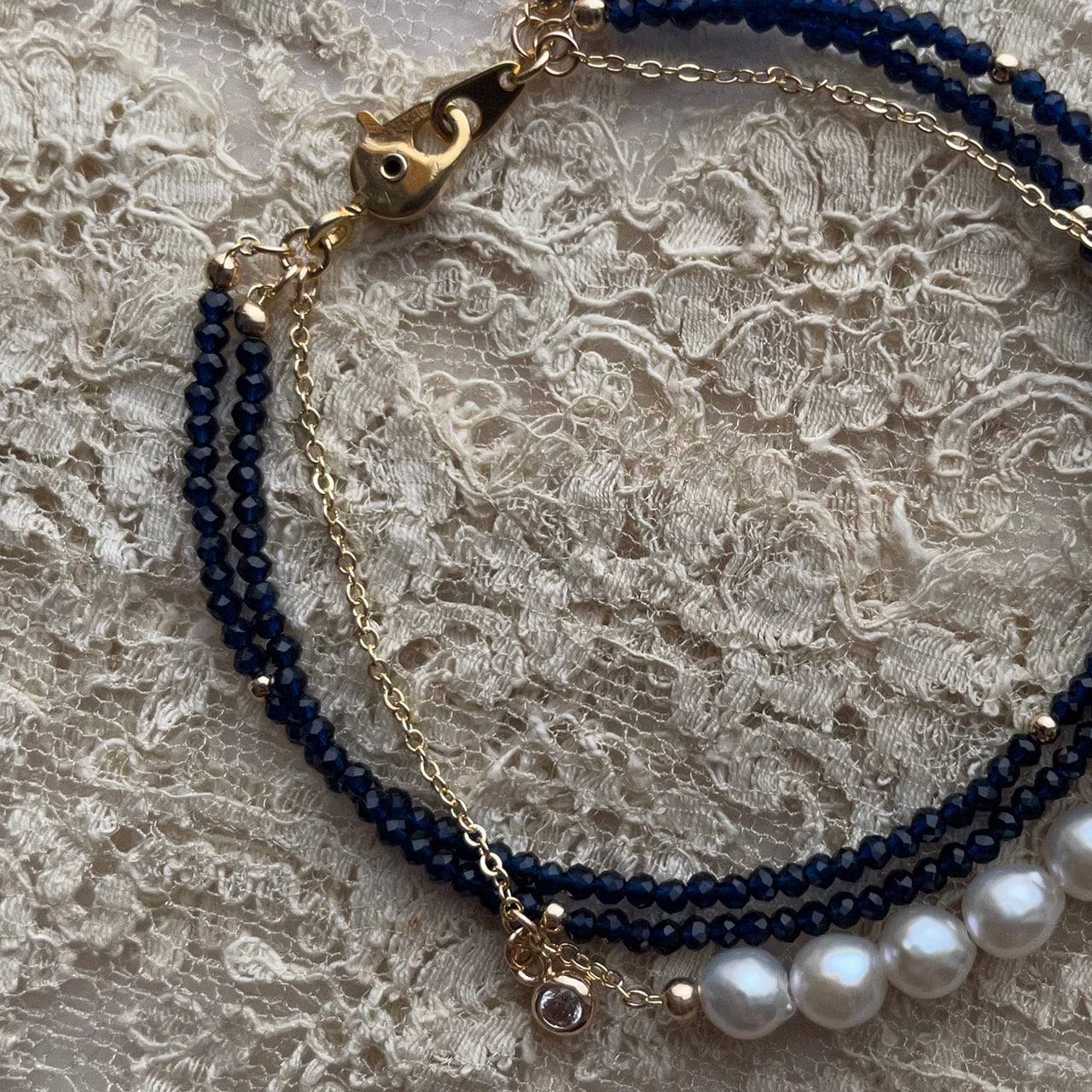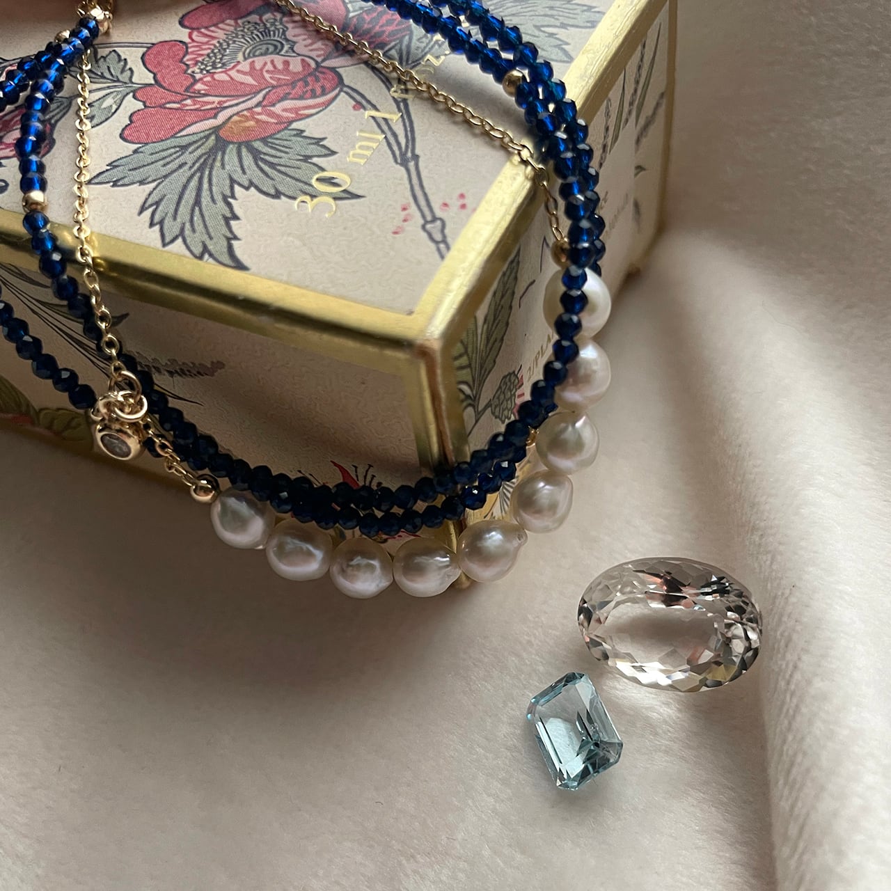 ブルースピネル2連につぶの揃った美しいパールを合わせています。