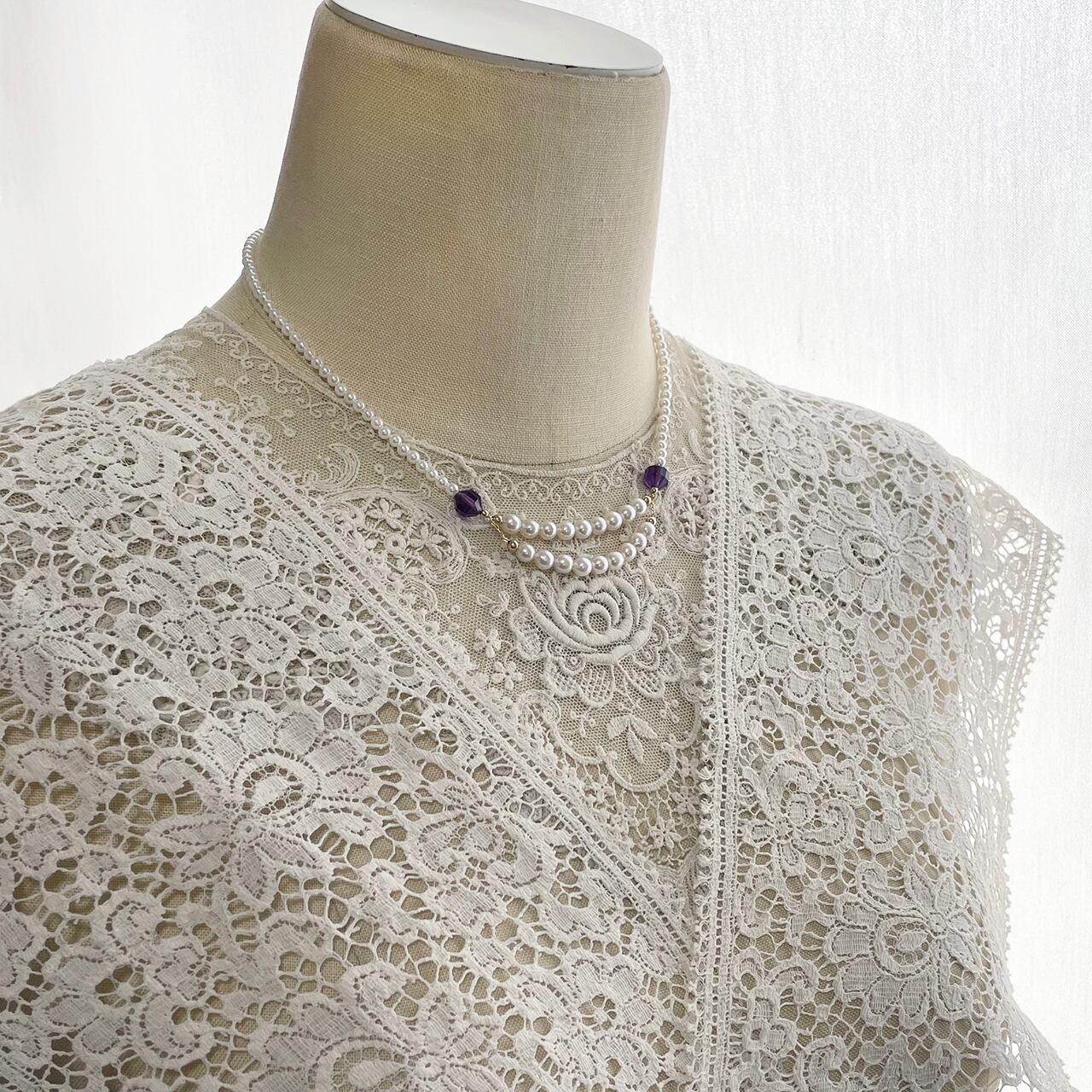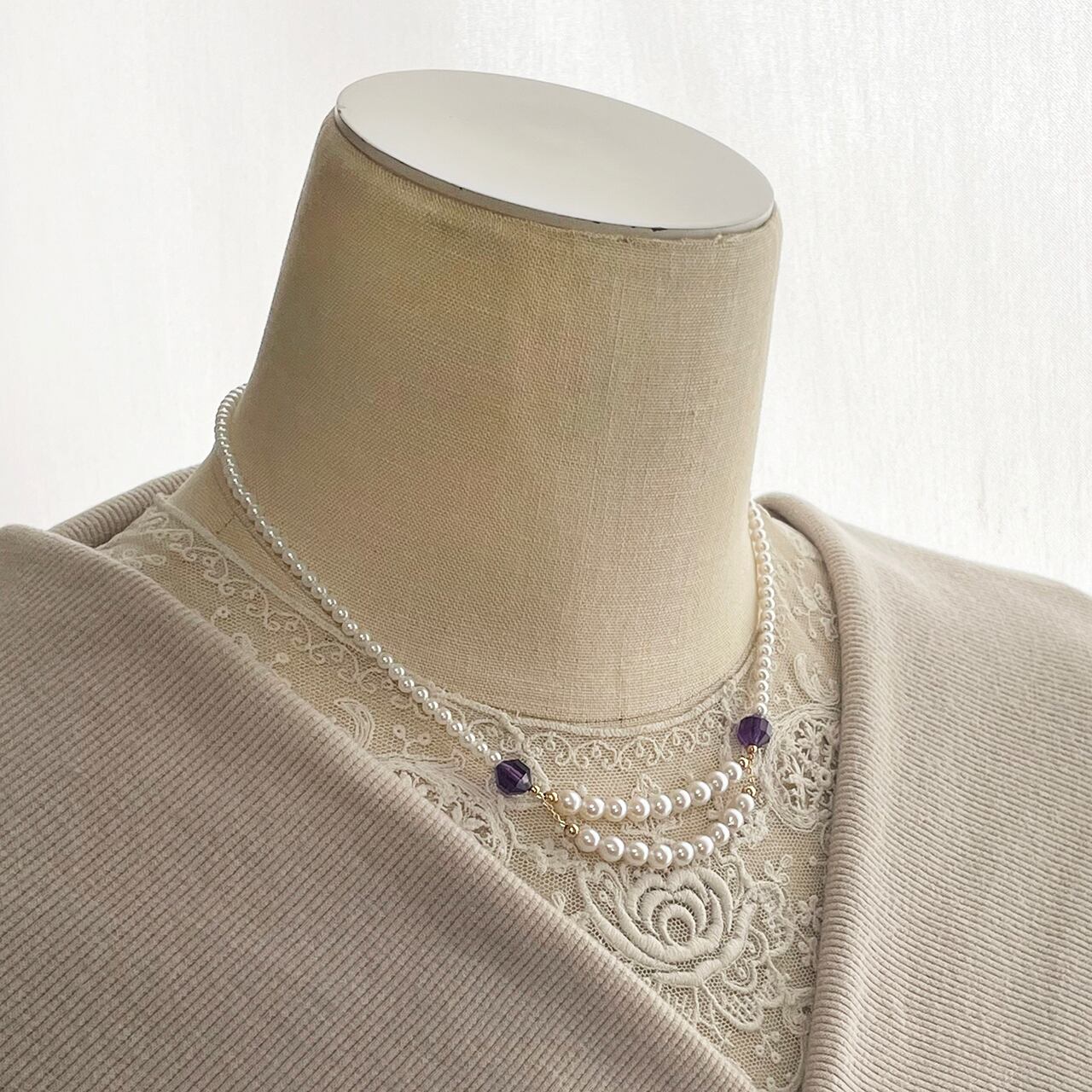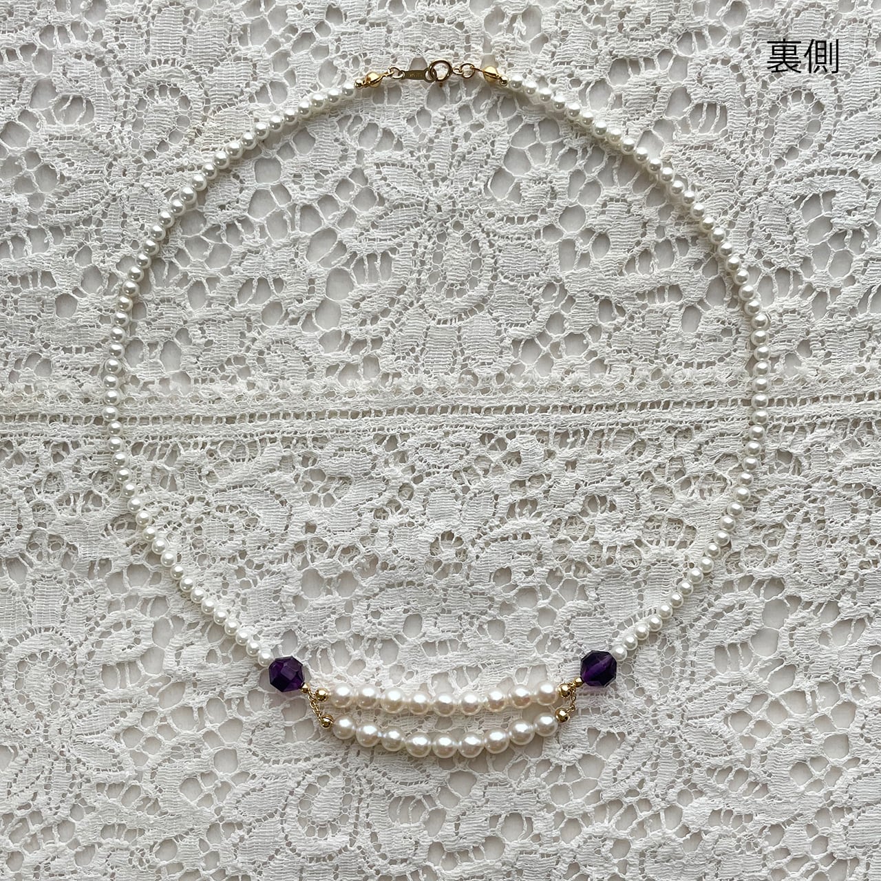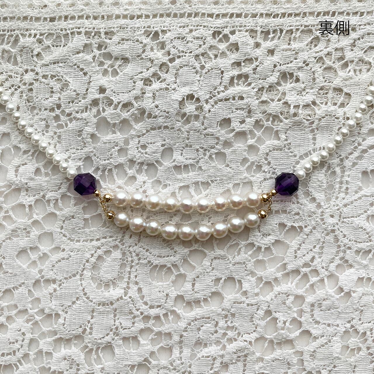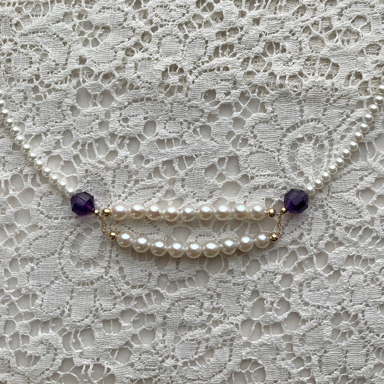 前は2連をチェーンでつなぎ、紫のアメジストが個性を演出しています。