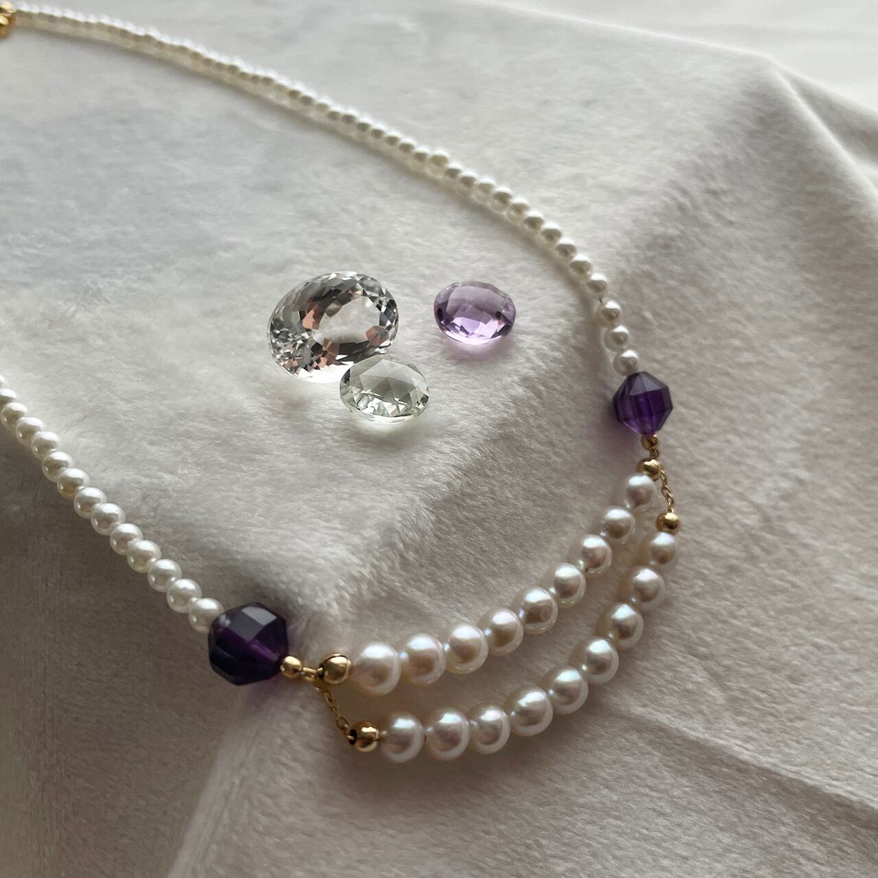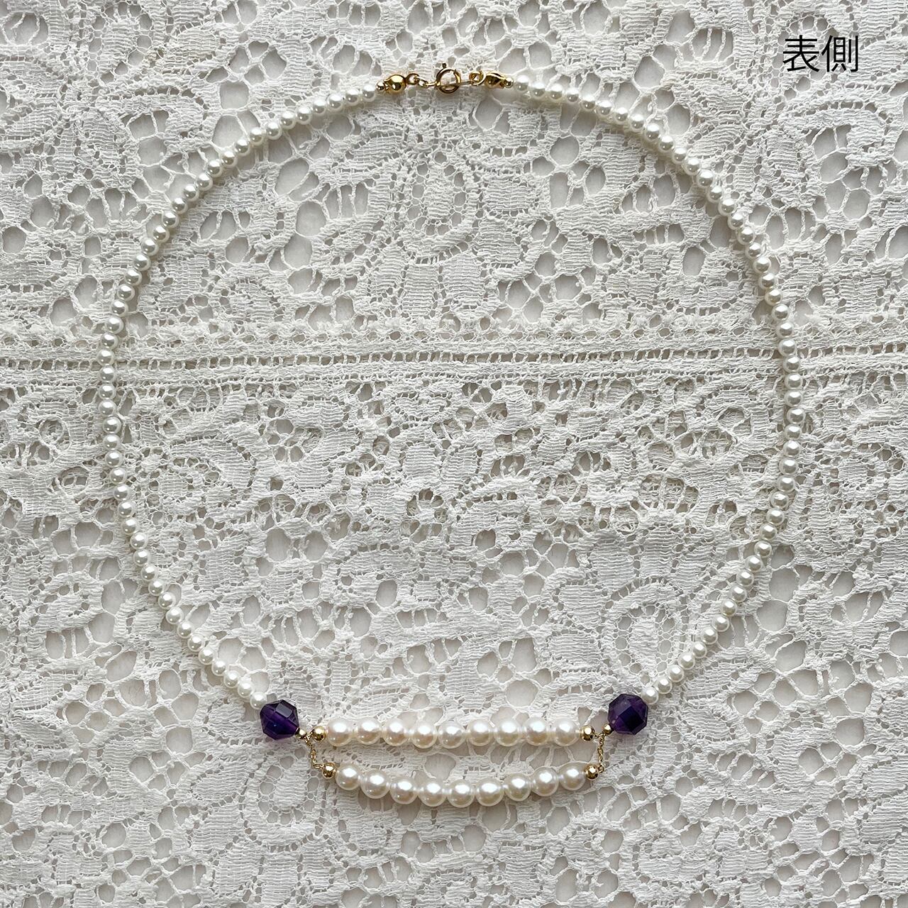 使用した天然石・ビーズは淡水パールとアメジスト、パーツは14kgfです。