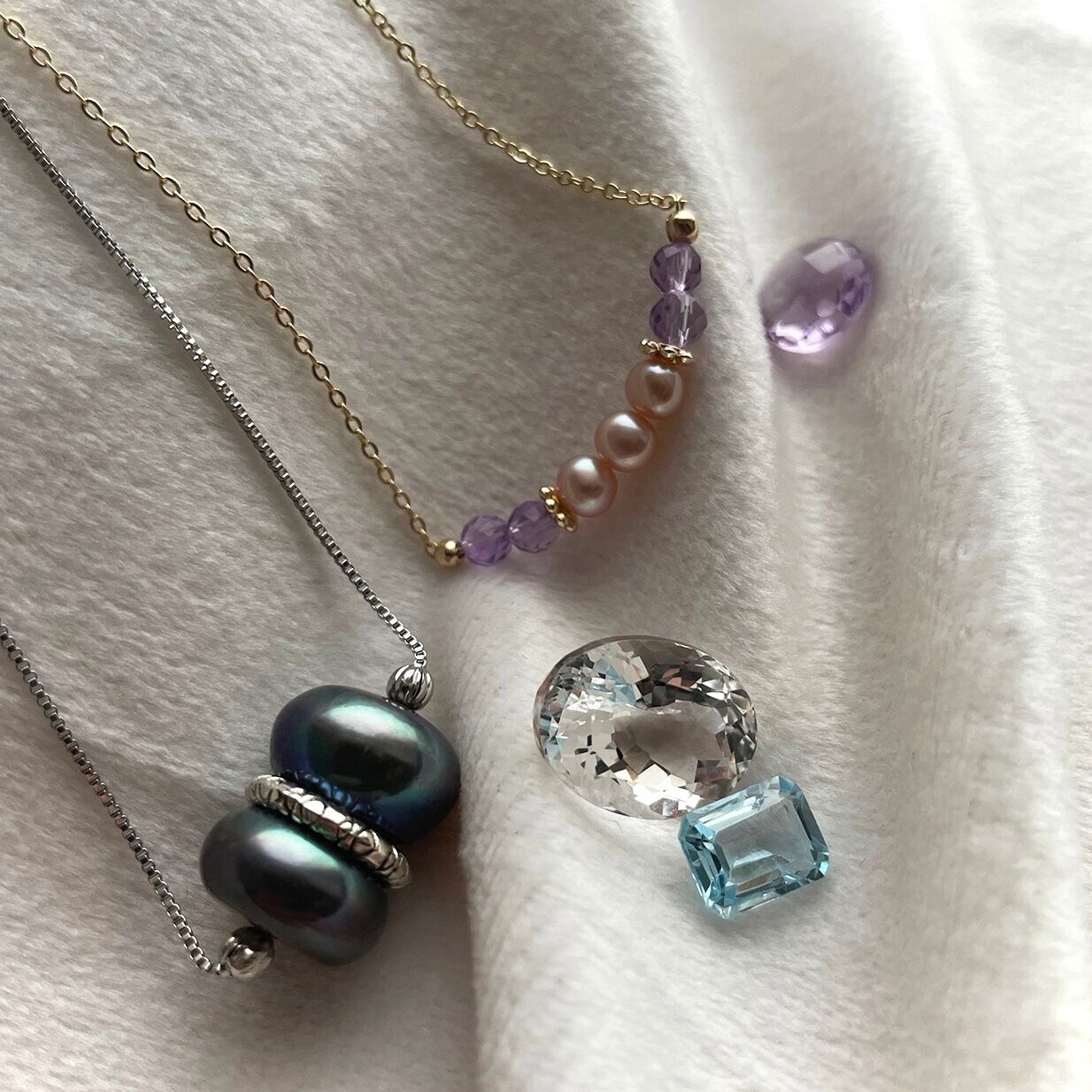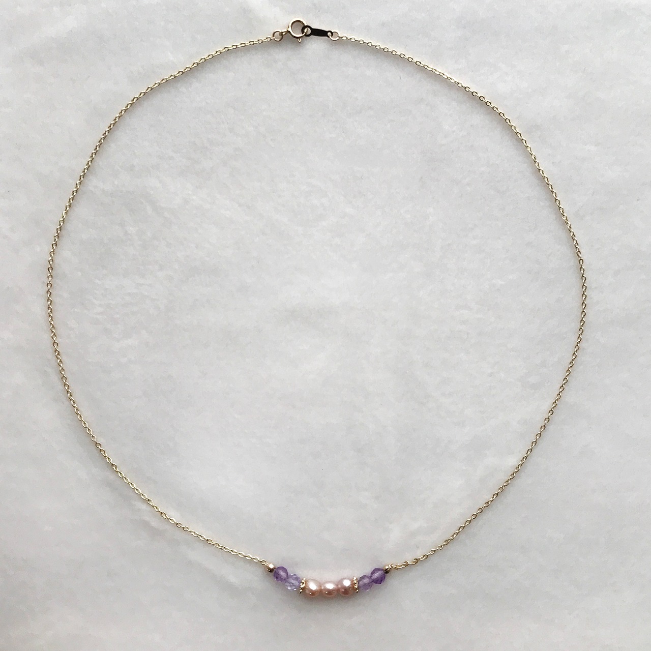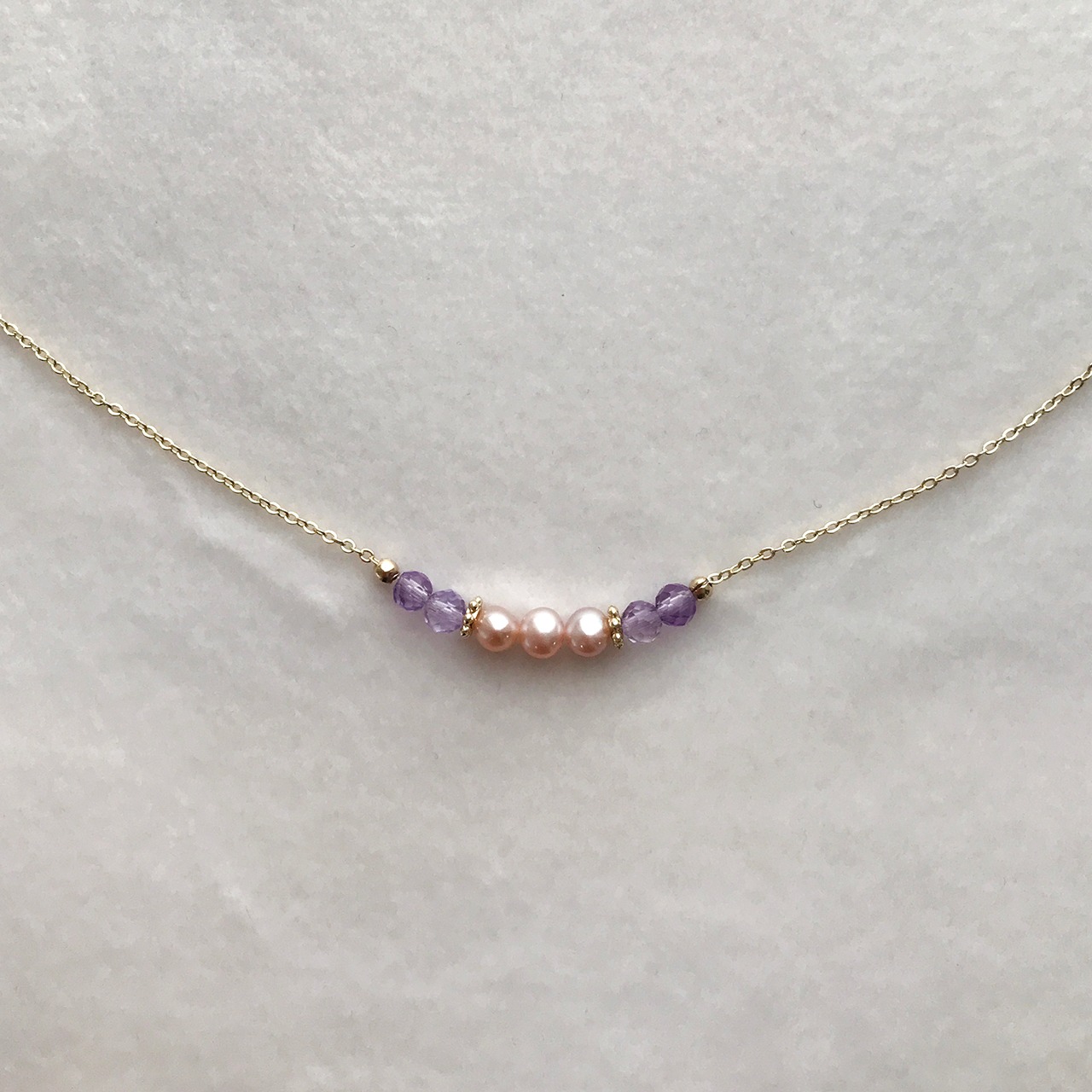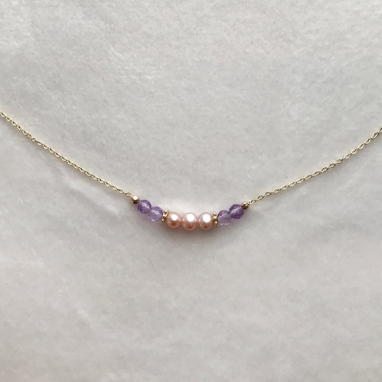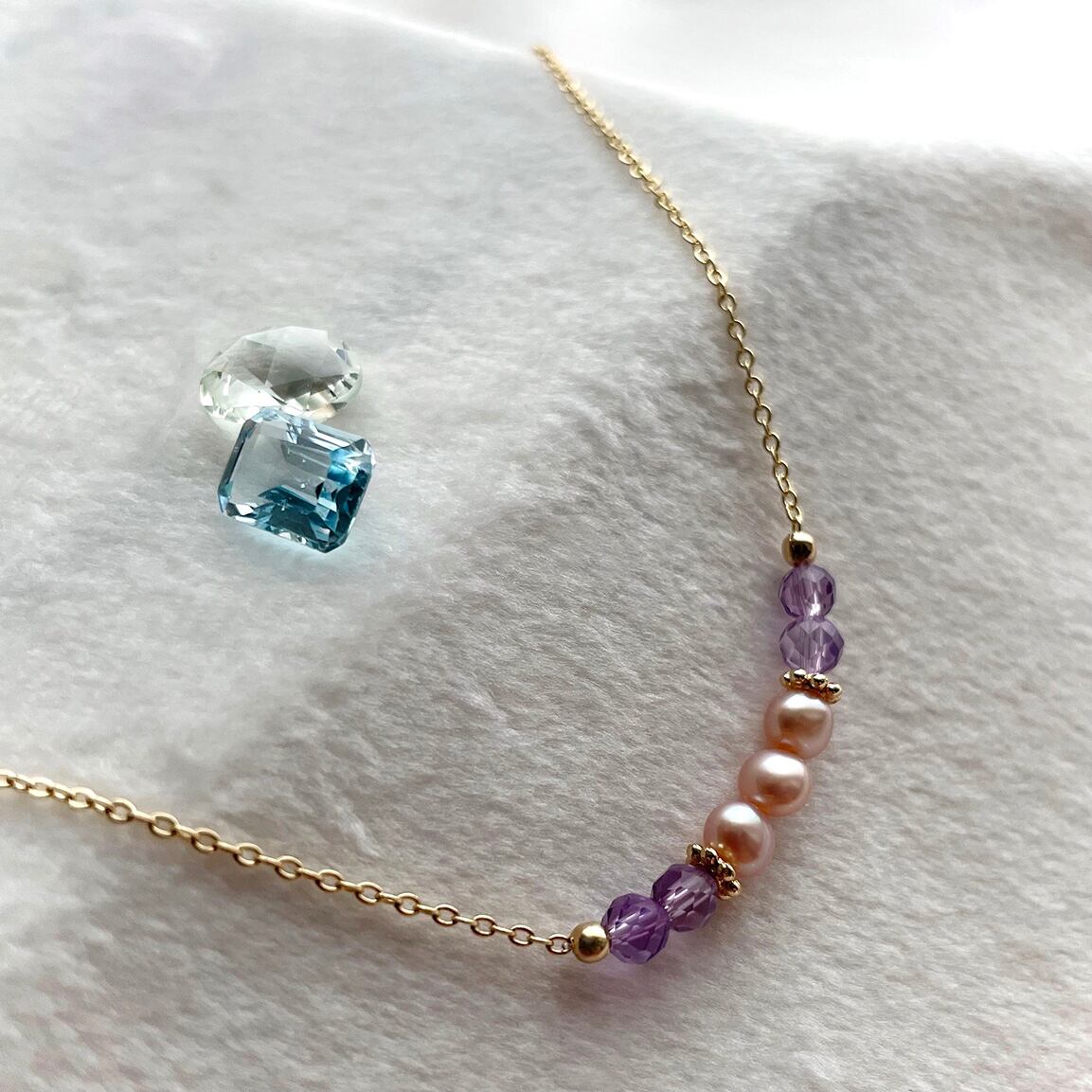 使用した天然石・ビーズは淡水パールとアメジスト、パーツとゴールドビーズは14kgfです。