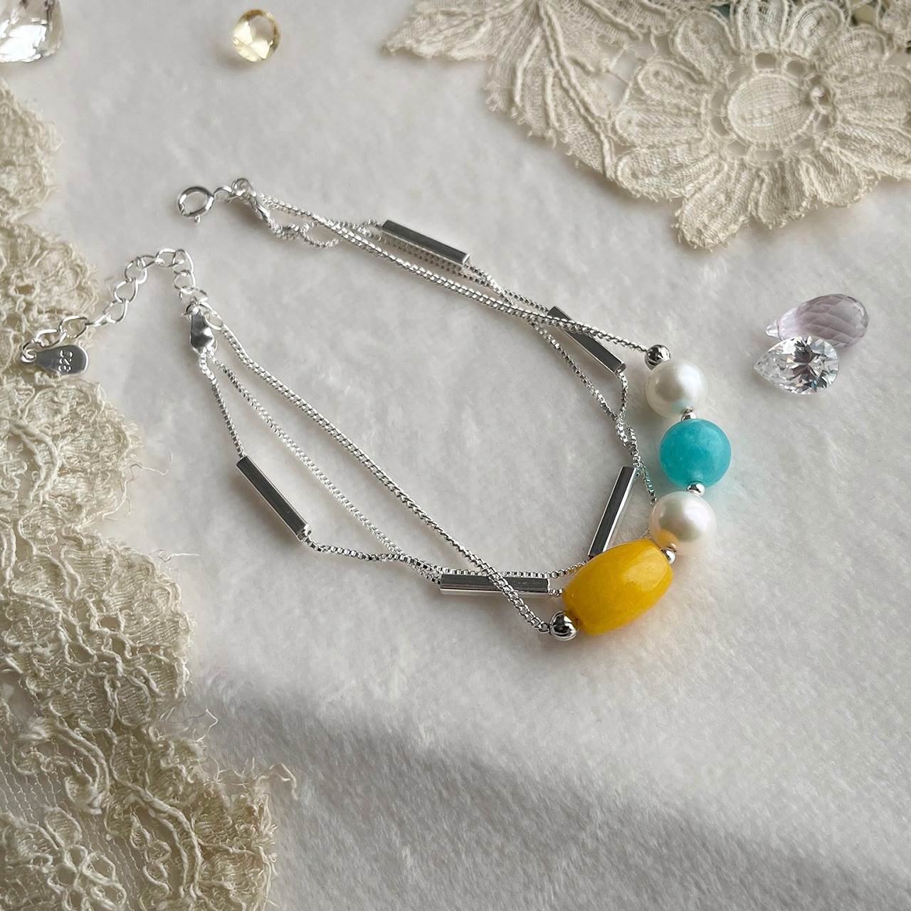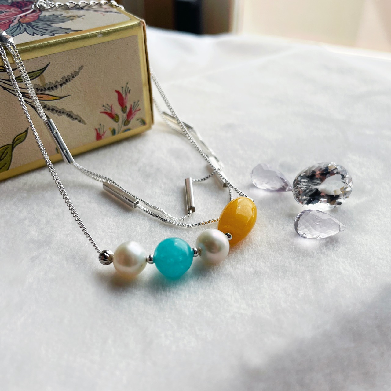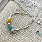 使用したビーズ・パーツは黄ひすい、アマゾナイト、淡水パール、シルバーです。