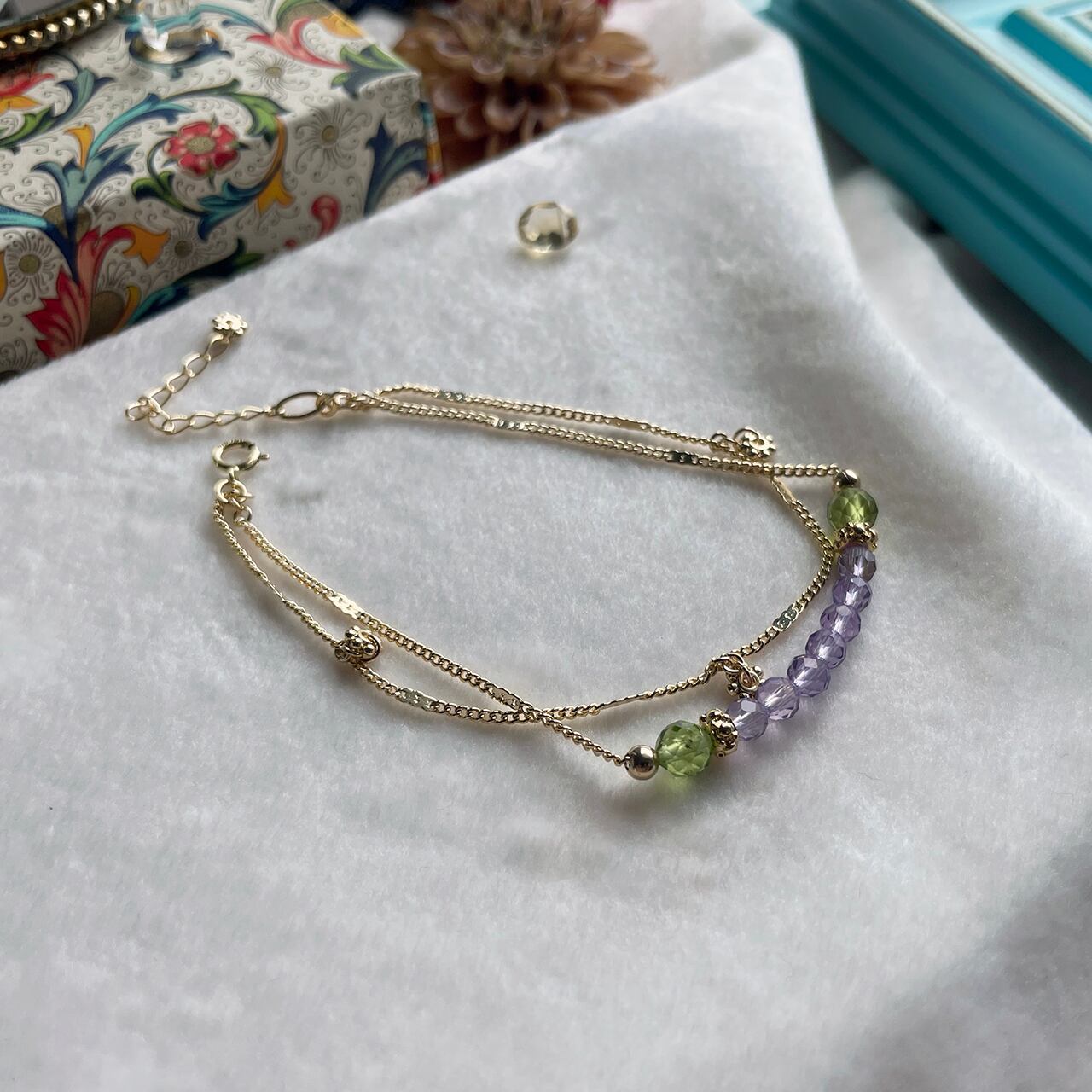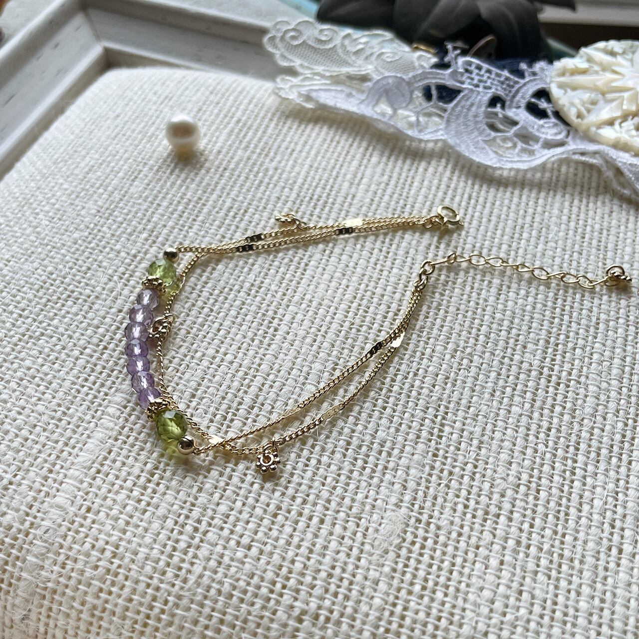 面取りしたアメジストとペリドットのビーズがキラキラ優しく涼しげなブレスレットです。