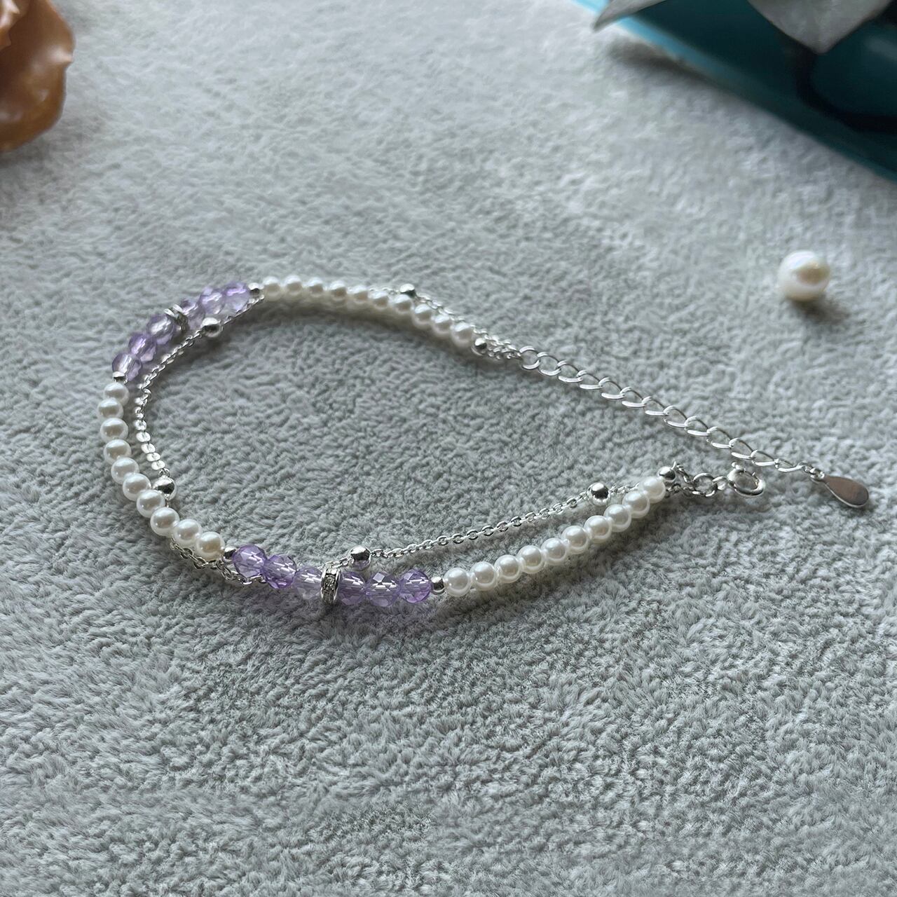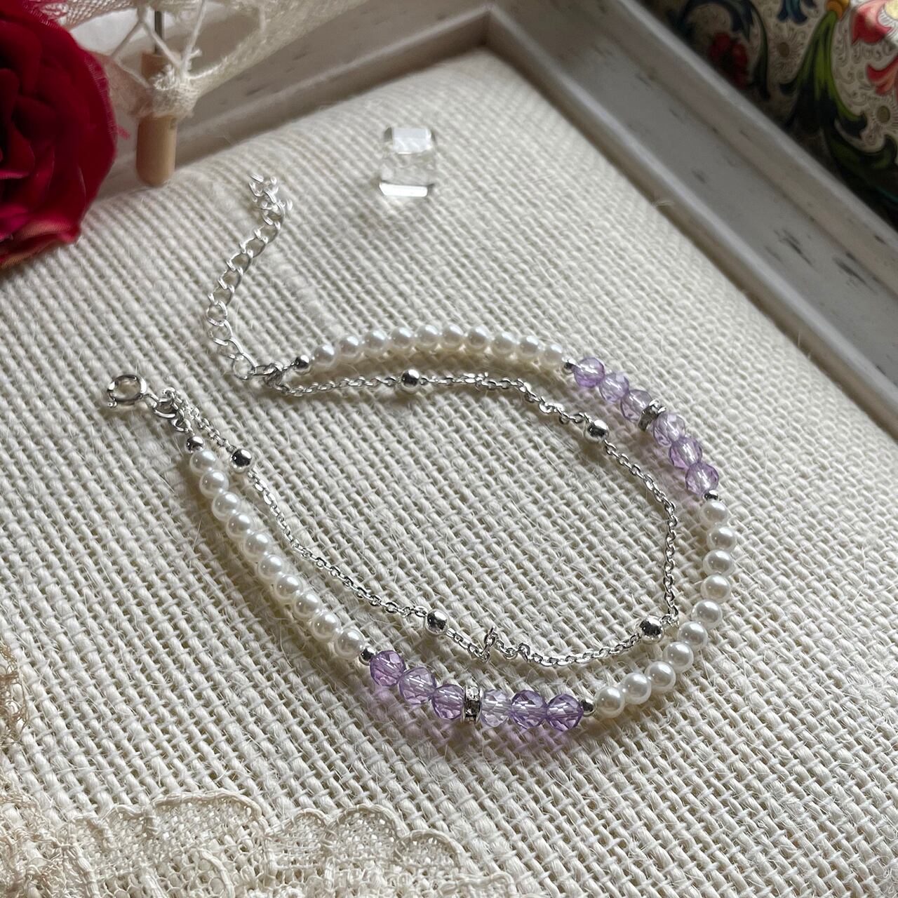 優しいカラーが印象的な淡水パールとアメジストのブレスレット。