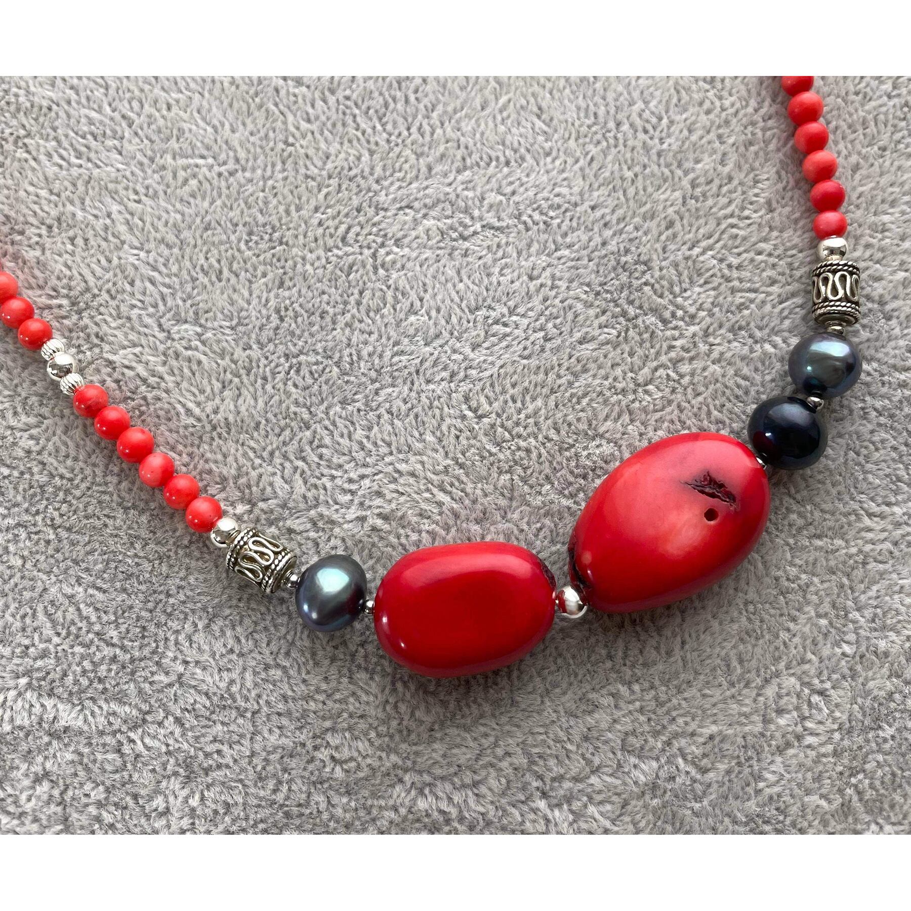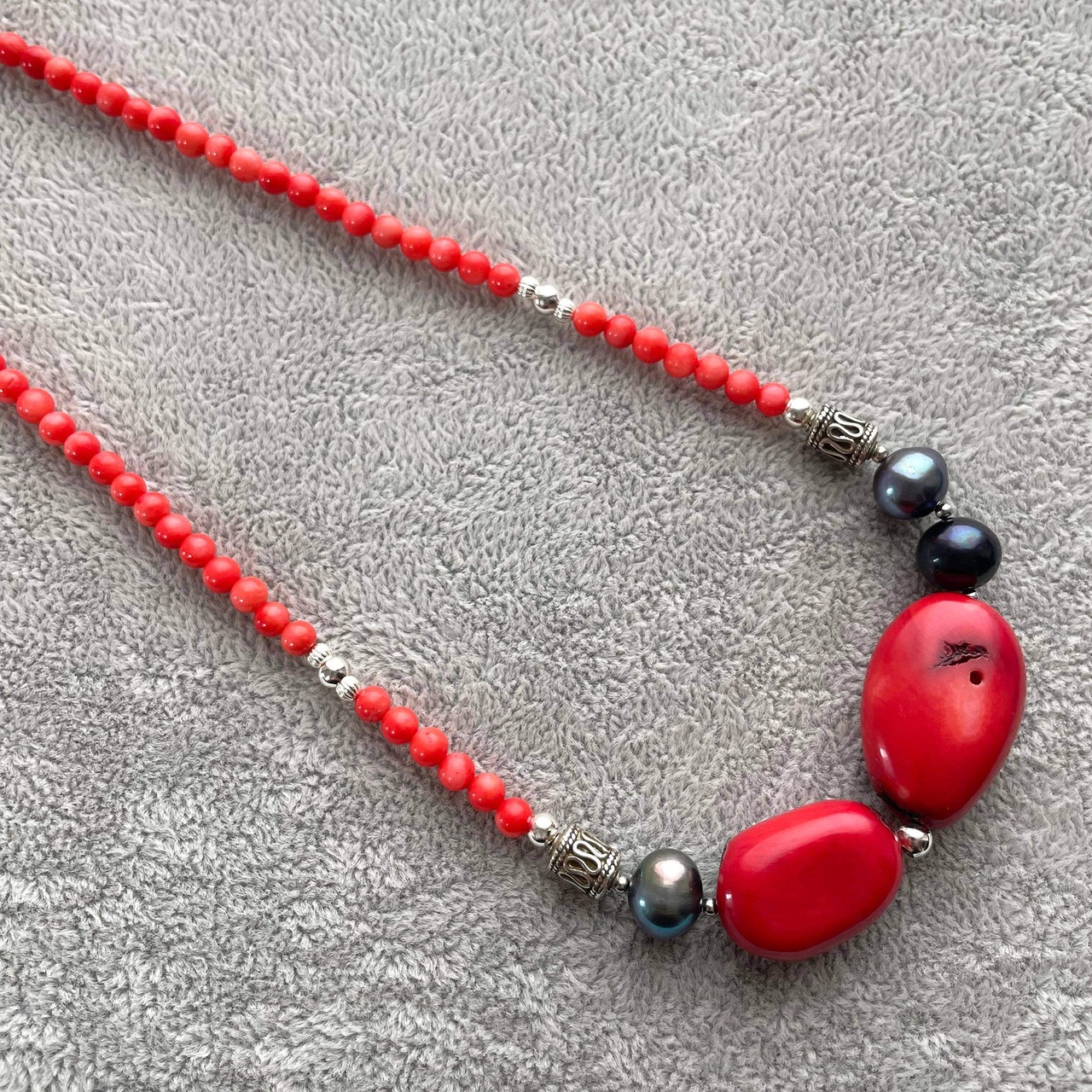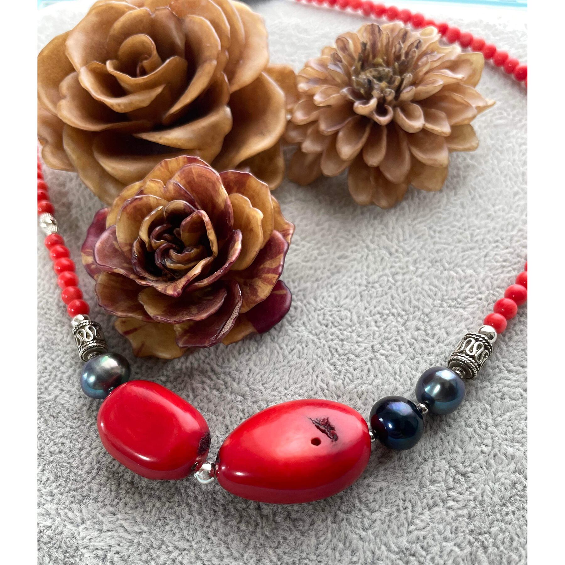 大きな赤いさんごと淡水ブラックパール、シルバービーズを使用した